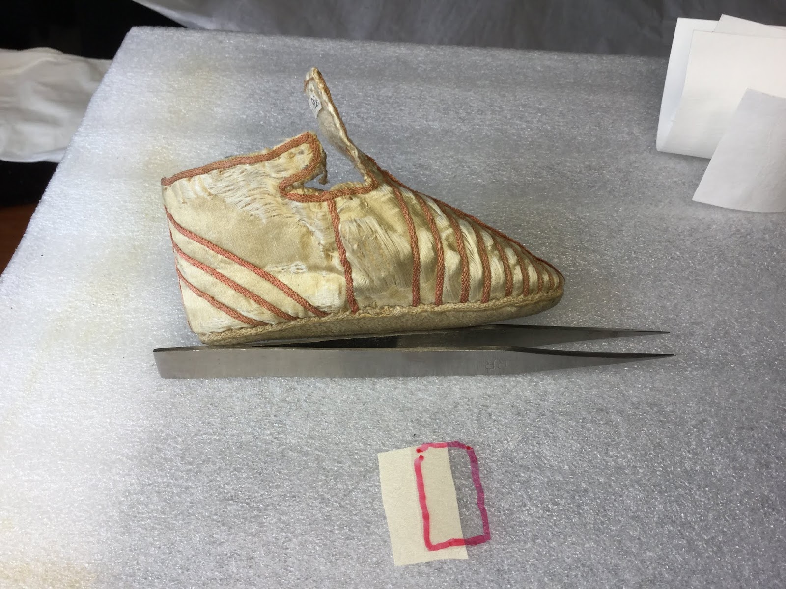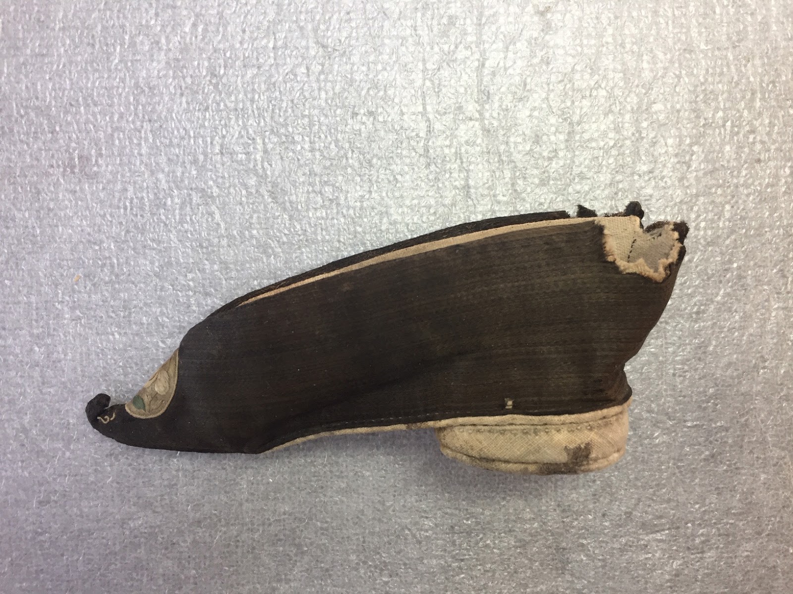 My plan was to continue conservation on easily transportable artefacts to be displayed in the upcoming 18th century exhibition, The Great Divide. The selection of tools was based on the first two projects, a pair of baby shoes and a fragment of Indian cotton. The magnifying lamp is necessary for fine hand stitching; the padded acrylic stand elevates small artefacts to a comfortable working height; smaller tools (micro brushes, hair silk, tweezers, curved surgical scissors, beading needles) are items I keep on my desk at the museum as they are used on a regular basis. There are three artefacts awaiting treatment: a bound foot shoe, a pair of baby’s shoes and a fragment of chintz, an Indian cotton fabric. Today we will focus on the bound foot shoe and a pair of baby’s shoes.