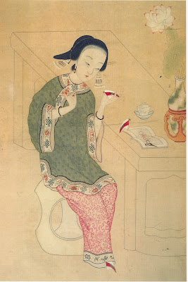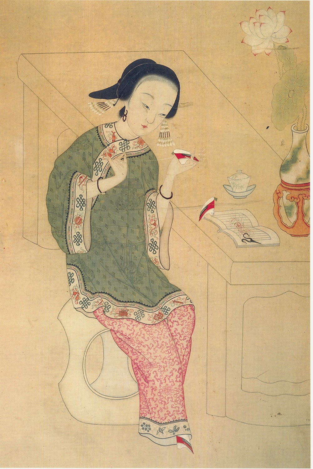 Chinese painting on paper of a woman sewing lotus shoes, late 19th century.