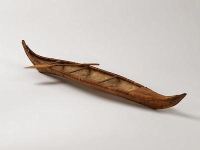 This model of a birch bark canoe, accompanied with a wooden paddle, is from the early 19th century.