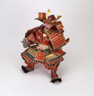 This carved and painted wooded doll is adorned with body armour holds a fan in his right hand and a sword in his left. His shoes are very similar to a pair in the BSM’s collection.