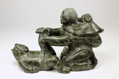 Soapstone sculpture of an Inuit mother, with a child on her back, putting boots on another child. Handmade by Canadian Inuk artist Killy Peshuktu, 1993.