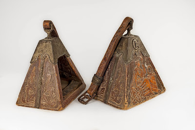 Pair of Chilean wooden pyramid-shaped stirrups with an embossed design of a female figure holding a staff.