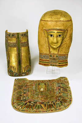 Egyptian mask, a pectoral and a foot covering. Ensemble is from the Roman Period, circa 1st century CE.