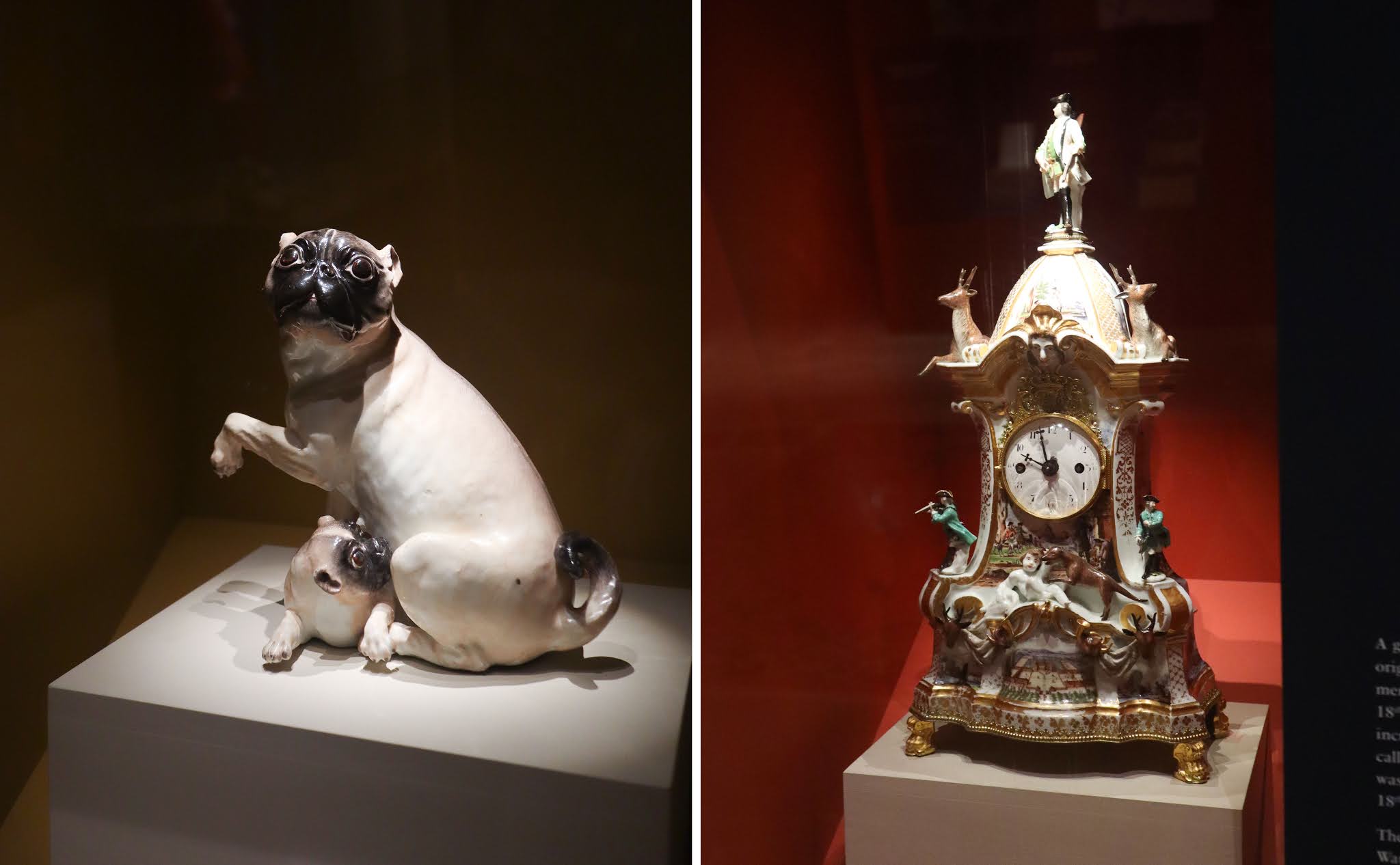 There are a number of strategies that we used in our 18th century exhibition when we wanted to fill these collecting gaps, and tell stories of people whose footwear is no longer extant. Firstly, we reached out to other museums for loans. We were not able to find men’s footwear that we could borrow for the 18-month duration of the exhibit, but we reached out to the Gardiner Museum and we were able to borrow an amazing clock made for Augustus III, King of Poland, in the 1730s. This clock featured a hunting scene, including little figurines of men in their riding costumes. This was perfect as it allowed us to discuss men’s boots, and their ties to land-ownership and male privilege. Fortunately, we were able to borrow several ceramics from the Gardiner Museum, which are featured alongside our footwear throughout the exhibit.