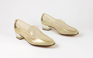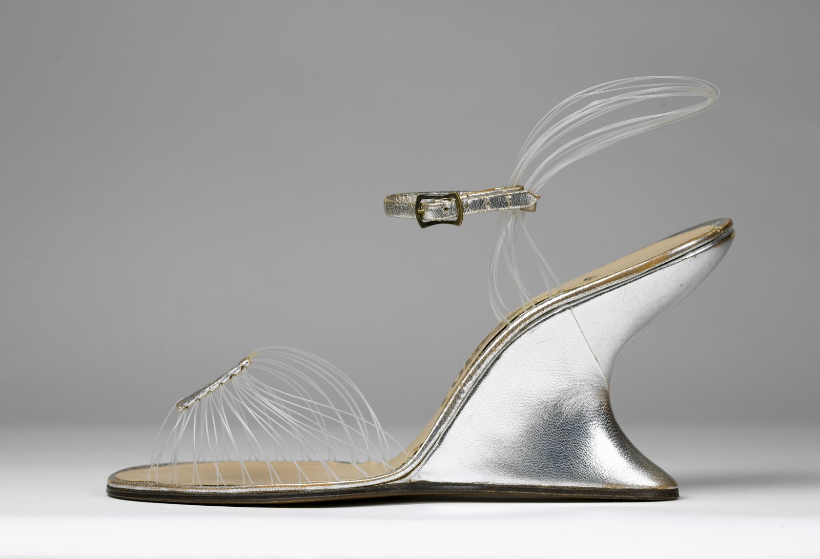 In 1907 Leo Baekeland created the first fully synthetic material, the famous Bakelite. This innovation led to the synthesis of scores of new plastics throughout the 20th century. Modern materials were used in design to create new and intriguing effects. This Salvatore Ferragamo sandal from the 1940s uses nylon thread to give a spun silk effect that looks lighter than air. Although the strands are thin and translucent, the nylon material is resistant and strong. In the 1960s, Herbert Levine used PVC and acrylic to create clear loafers that exude space-age sophistication. PVC is important to this design because it can be made transparent and flexible, while acrylic looks like glass, but is much stronger and lighter.