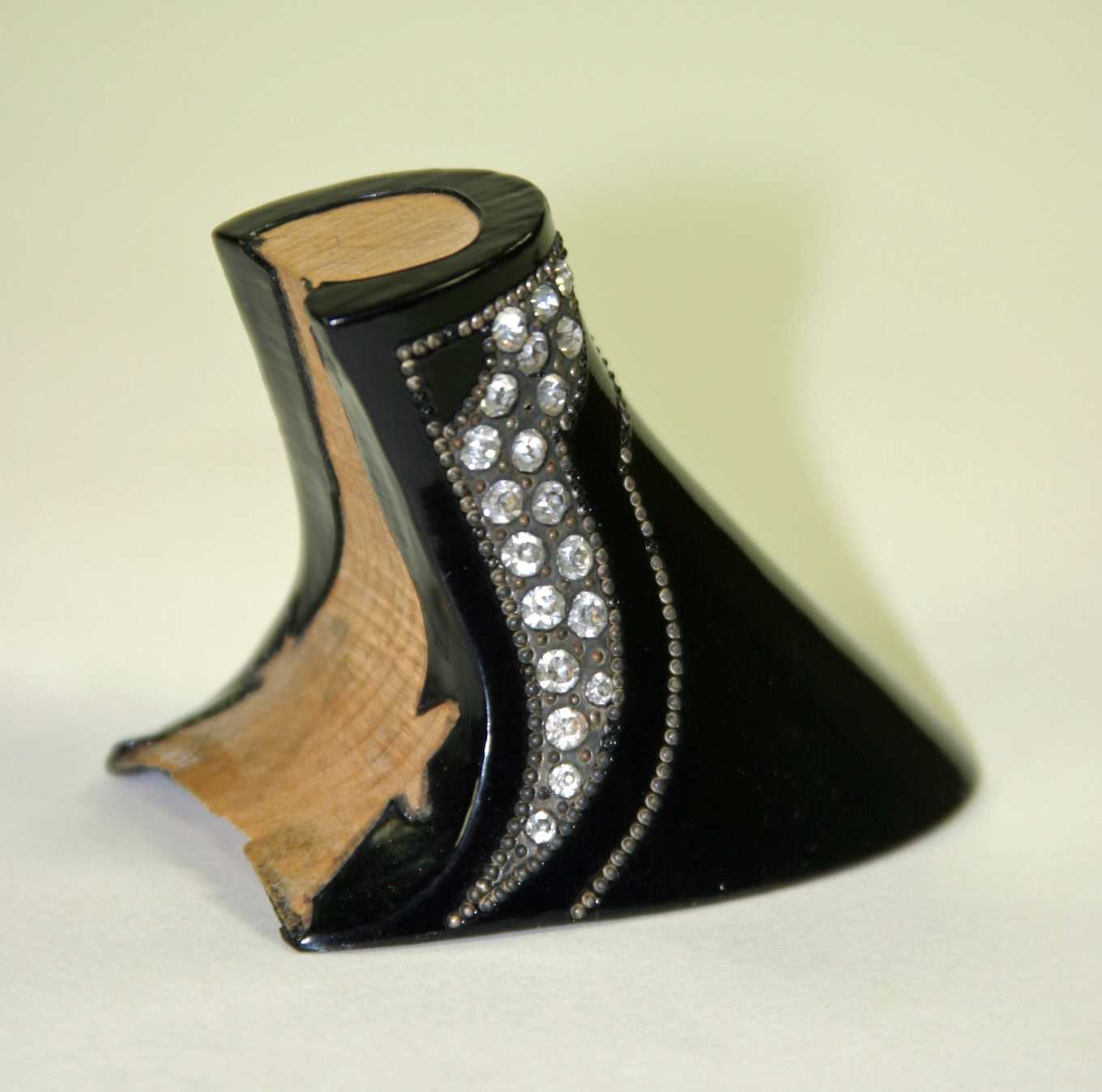 In 1862 Alexander Parkes created “Parkesine” by reacting cellulose (from cotton linters) with nitric acids. This cellulose nitrate material was commonly used in a decorative manner and shaped and coloured in order to imitate expensive natural materials such as ivory and amber. Cellulose nitrate was often produced in films and sheets that could be shaped over a backing material. As I’ve gone through the Bata collection, I have discovered a wealth of shoe heels from the early 1900s and 1920s that have shiny black “lacquered” heels. Applying layers of resin to wood creates a lacquer finish, but the heels I’ve found appear to be one solid, shiny piece wrapped around a wooden base rather than a coating. I suspect that these heels may be covered with cellulose nitrate, and I intend to do some testing to find out!