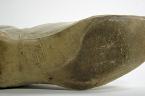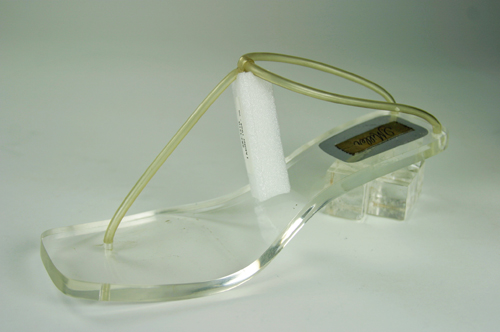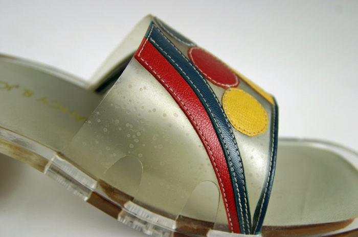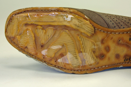 The rubber sole of this shoe has become soft and sticky. This is likely due to chain scission. In order to prevent it from adhering to other surfaces, the conservator has attached a Mylar barrier. Exposure to UV radiation and light can cause the development of chromophoric groups. This development causes a formerly white or transparent plastic to become yellow. This is very common with objects made of nylon and PVC. Below are images of shoes with nylon and PVC straps that used to be transparent, but turned opaque and yellow due to light exposure.