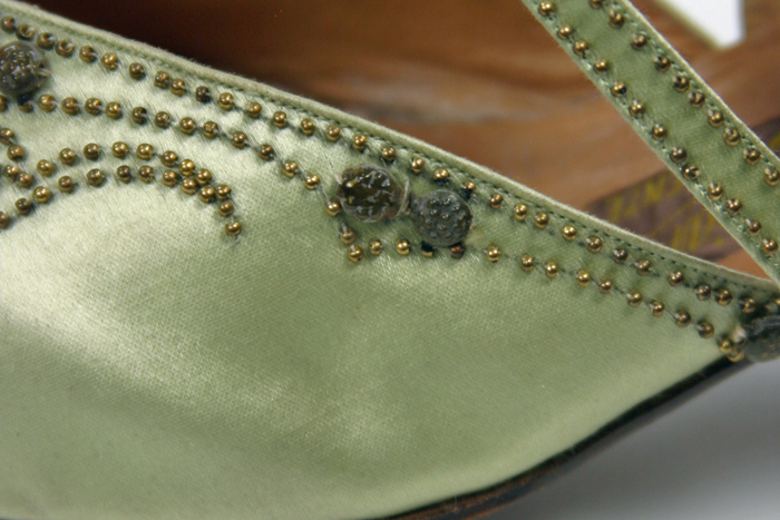 Some plastics are more problematic than others. Most plastics only damage themselves as they degrade. So-called “malignant plastics” are a danger in the museum as they can harm nearby materials as they deteriorate.[1]Plasticized PVC, polyurethane, cellulose acetate, cellulose nitrate and rubber (usually highly vulcanized hard rubber) are the bad guys of the plastics world. Cellulose nitrate is the most notorious of these villains. With exposure to moisture, cellulose nitrate eventually breaks down and releases nitric oxides, which quickly become nitric acid. Nitric acid is highly corrosive, and can damage nearby objects and materials. The 1920s shoe below is decorated with two types of beads. The small beads are brass, the larger beads are of an unknown material. The brass beads that are in contact with the unknown beads are starting to corrode. I suspect that the unknown beads may be cellulose nitrate!