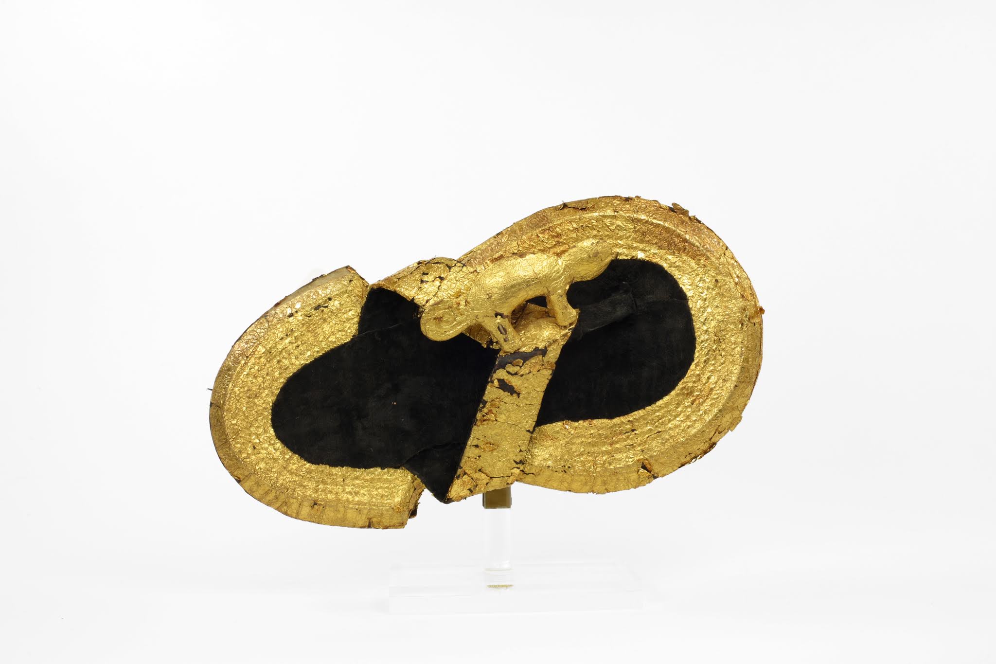 The feet of the Amanhene, or Paramount Chiefs, of the Akan are never supposed to directly touch the earth. When seated, a ruler’s sandal-clad feet rest on a cushion and sandal bearers stand by with spare often symbolic pairs such as this example. Gold, and gold embellished objects, were a way for the leader to show the wealth of the community to the public. Pieces that are damaged or worn out are often sold, this piece features extensive repair to the gold-leaf.