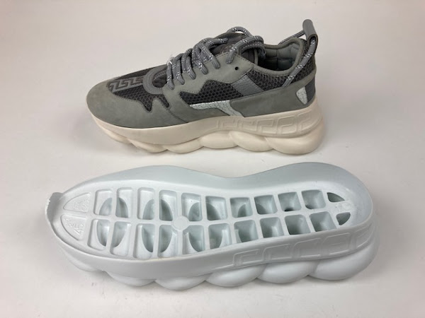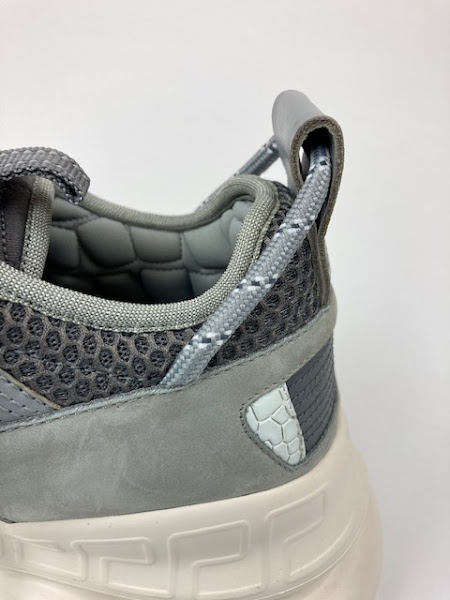 The heel area on the outsole of Chain Reaction has important subtle details, including this signature Medusa head which is the signature of the Versace brand.