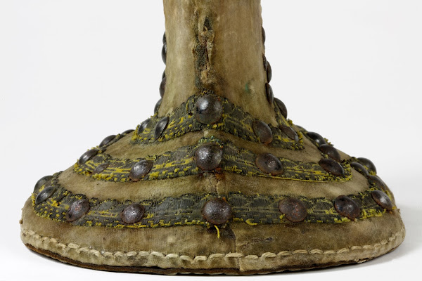 X-rays reveal that its pedestal is of soft wood probably fir that has been carved in typical Italian fashion with a flared base. However, rather than being covered in white kid as would be seen in Venetian examples, this chopine is covered in gold velvet. The base is embellished with three rows of gold braid as well as tacks that both secure the braid to the base and form decorative floral motifs on the sides of the bases, similar in placement to the stamped floral shapes found on Venetian chopines.