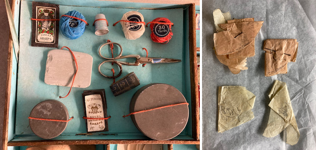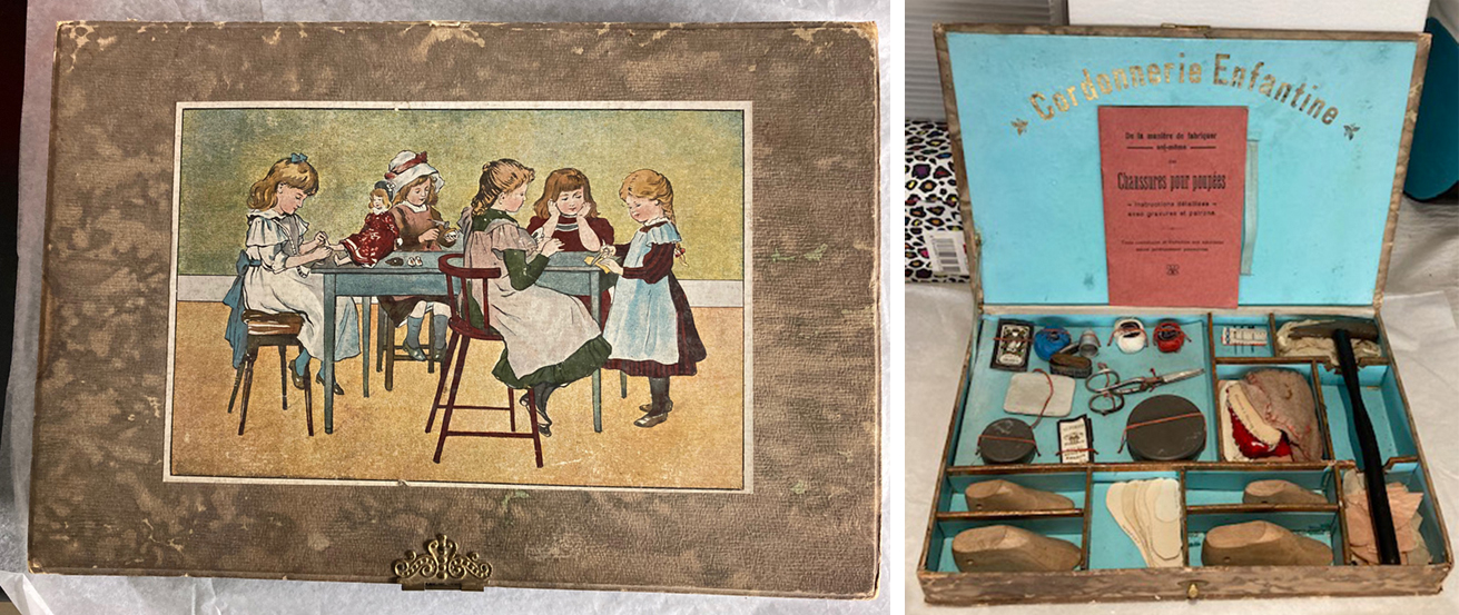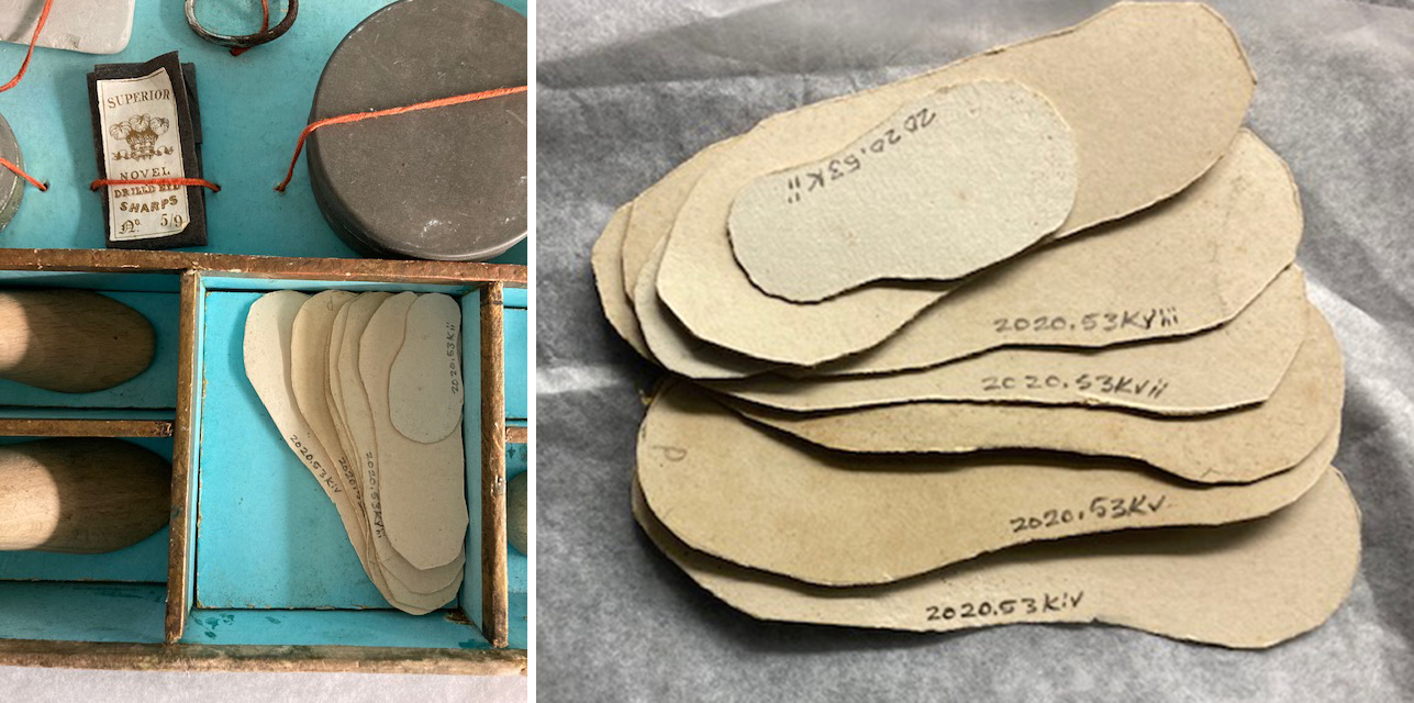 The number can get more complicated if there are separate pieces making up each component. A few weeks ago when accessioning a doll’s shoemaking kit, I had to number 14 components, so I used component letters A through N. The complication was that each component has components! To deal with this, our system allows for Roman numerals as the next number set. The doll’s shoemaking kit has a paper pattern component N with 11 pieces to it, so these became Ni-xvii.
