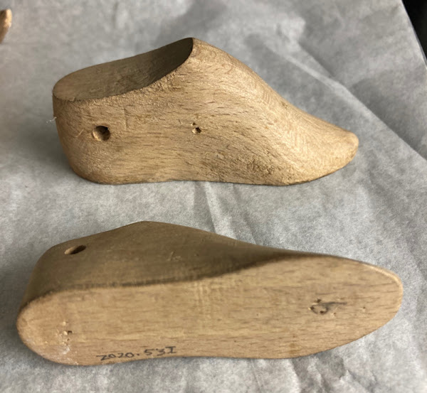 Every museum determines their own system for setting up a compound number. At the Bata Shoe Museum, our system is alpha-numeric and includes a set of two numbers followed by letters if there is more than one part to the item, and then Roman numerals if the parts get even smaller. The first part of the number is simply the year of acquisition, so for example, all of the acquisitions this year start with “2020”. The year is followed by a period and then the next number. The next number is a simple number sequence that begins with “1” for the first acquisition of the year and increases from there, allowing us to see how many new objects came into the collection that year. This number is followed by a period, and then finally the various components of the item are identified with a letter, beginning with ‘A’. Here is an example: 2020.0236.A-D