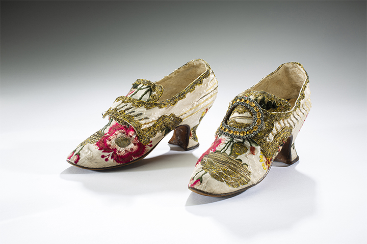 The English shoes date to the 1760s. They were acquired by the Museum in 1995 from the auction house Christie’s in London.