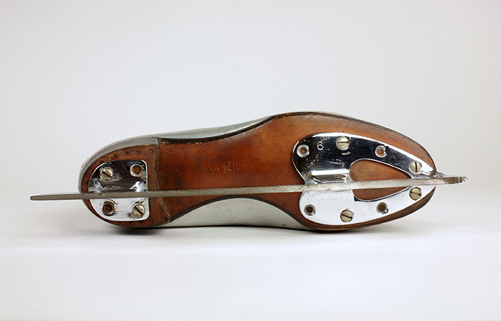 The skates were made of leather uppers that are very well worn and were repaired using silver tape at the side of the toes. This pair may have been worn for performances as silver is not a typical colour for figure skates.