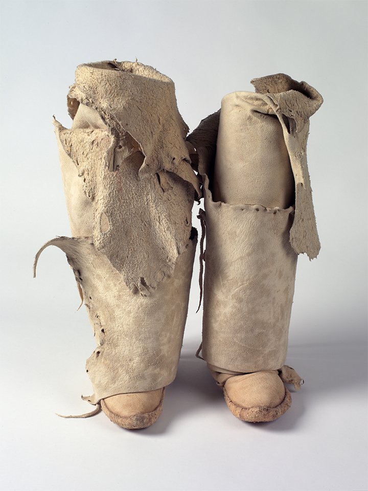 The soles of these boots are made from durable raw hide molded into shape and then dried. The uppers and shafts are made out of white deerskin. Each boot features shafts made using one complete deerskin that wraps around the leg and is held in place by deerskin ties. Wedding boots required that the bridegroom make his stitches invisible to the eye and that he sew the soles to the uppers without turning the boots inside out. This difficult requirement made the creation of wedding boots a true test of skill and devotion.