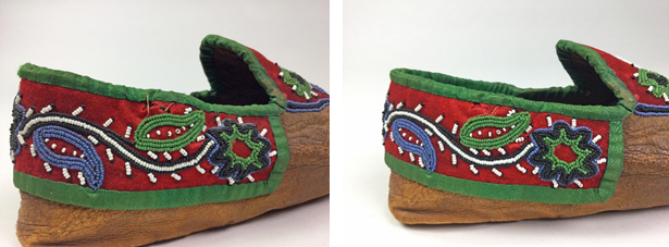 The next loan includes 9 pairs of moccasins, 1 pair of mukluks and 1 pair of kamiks that will leave for Ottawa sometime in June of this year. The process of preparing a loan involves examining each artefact and determining if conservation treatment is necessary, then writing detailed condition reports which are accompanied by photographs.