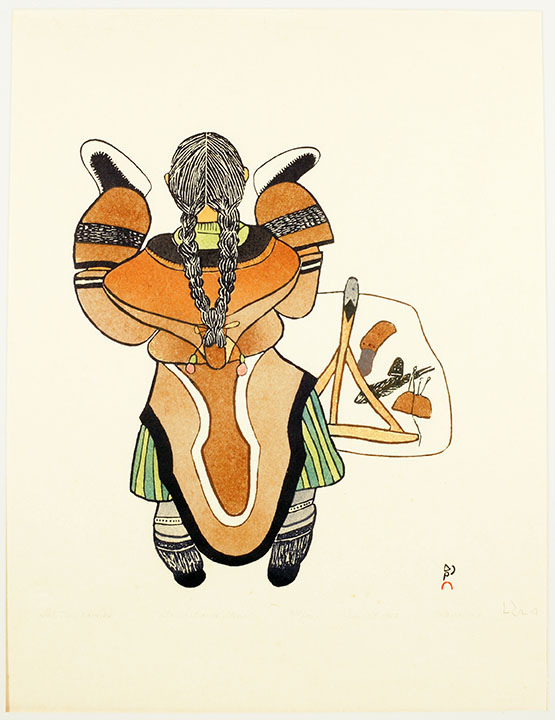 The subject of this work is the completion of a new pair of kamiks. We see the back of a seamstress who holds the new pair on her hands. In front of her are the kamik-making tools that she used to create the boots. Ashoona was not only an accomplished visual artist, she was also a seamstress and her work making kamiks surely informed this piece.
