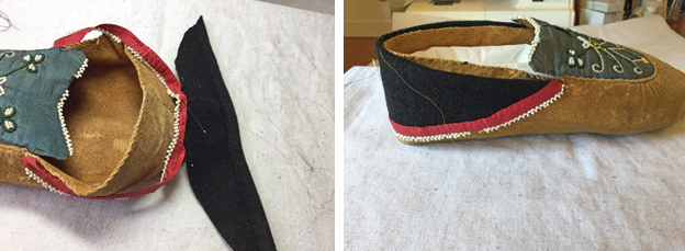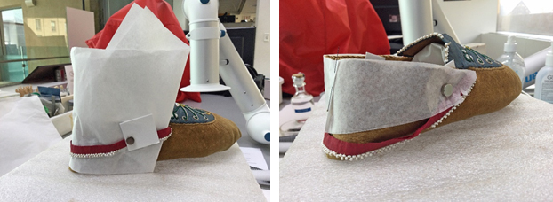 Fabric is always washed, prior to conservation, to remove any surface treatments applied by the manufacturer to facilitate premarket handling and shipping. A pattern for the new collars was created with tissue paper held onto the quarters on one of the moccasins with rare earth magnets. A pleat at the centre back was necessary to achieve the required shape as it wrapped around the heel area. This template was used to cut the new wool collars, plus the addition of 1cm for the hem at the top edge.