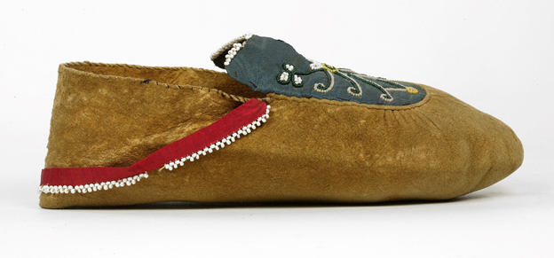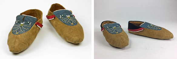 Originally, the red silk ribbon, with the white pekoe beadwork trim that drapes over the quarters, would have been attached to a fabric collar. The ribbon is folded in half; one side would have been sewn to the underside of the collar, the outward facing side of the ribbon would have been sewn to the front of the fabric. Examining similar Innu moccasins in the BSM collection and the Canadian Museum of History’s online collection indicated how the collar was attached to the deerskin topline edge.