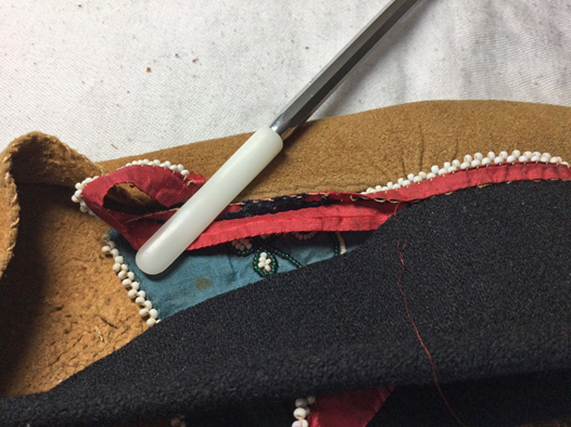 The hem was folded over and stitched in place. This would create a clean edge along the topline as it shows several millimeters above. The centre of the underside of the collar was matched to the centre of the underside of the ribbon, then stitched together working from that point towards the point of attachment on either side of the apron using a fine beading needle and hair silk dyed to match the ribbon. Then the right side of the ribbon was sewn to the right side of the collar using the same technique. The final step was to attach the collar to the moccasin using a beading needle that slipped easily underneath the existing stitches.